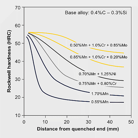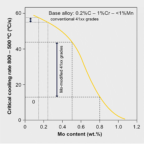 Molybdenum alloying strongly supports hardenability of carbon steels. The relevant physical metallurgical effects relate to solute drag on the phase front between austenite and ferrite as well as on molybdenum reducing the carbon activity. Consequently, the critical cooling rate for achieving transformation into either bainitic or martensitic microstructures is significantly reduced by molybdenum alloying. This greatly facilitates the production of strong carbon steels especially incombination with heavier gages. The hardenable depth of a steel is simulated on laboratory scale by the Jominy end quench test. Such tests indicate that the hardenable depth drastically increases with the molybdenum alloy content saturating at approximately 1%Mo. In fact, molybdenum has the strongest hardening effect amongst the alloying elements in the order: C>Mo>Cr>Mn>Si>Cu>Ni. When alloying combinations of these elements, molybdenum generates synergy effects that can further boost hardenability. In that respect CrMo steels and especially NiCrMo steels are prominent examples.