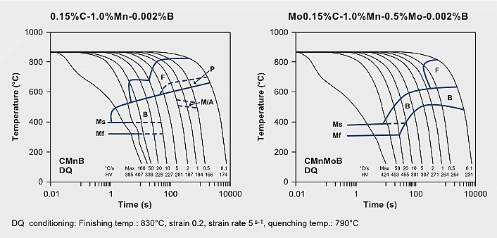 Often boron microalloying is used for enhancing hardenability in carbon steels. Less than 20 weight ppm of boron are needed to achieve a maximum effect. For being effective, boron must be in solution and segregated at the austenite grain boundary. Molybdenum alloying enhances the hardenability efficiency of boron by preventing it from forming iron-boron carbides (Fe23(B,C)6) in the austenite grain boundary and by suppressing dynamic recrystallization of austenite when quenching directly after austenite conditioning (TMCP). Hence, molybdenum alloying is highly relevant in classic reheat-quenched (RQ) and especially in modern direct-quenched (DQ) steels.