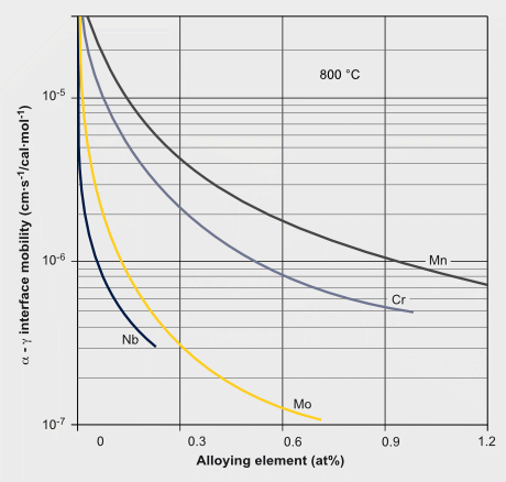 Molybdenum solute in austenite has the effect of lowering the activity of carbon. That again increases the solubility of microalloying elements such as niobium and titanium, which both are strong carbide formers. Hence, with molybdenum alloying soaking treatments of microalloyed steels can be operated at somewhat lower temperature. Furthermore, molybdenum delays strain-induced precipitation in microalloyed steels during TMCP treatments at lower austenite temperature. In that way, a higher share of microalloy species is preserved in solution for later precipitation in ferrite.