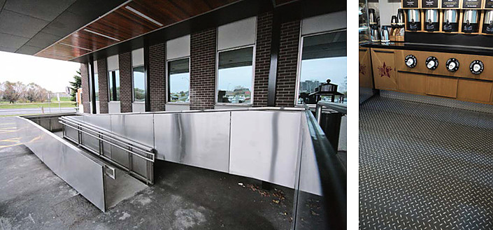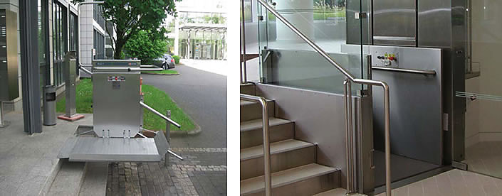 Stainless steel is commonly used for interior and exterior lifts because of its strength, corrosion resistance, cleanability, impact resistance and aesthetic appeal. The images below show two types of entrance lifts. Stainless steel is the ideal choice in environments where exposure to salt or pollution needs to be considered.