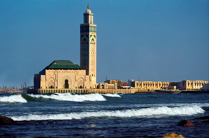 The Hassan II Mosque in Casablanca, Morocco, is one of the largest in the world. Its unique location partially extending over the Atlantic Ocean requires special protection against the aggressive saltwater environment.